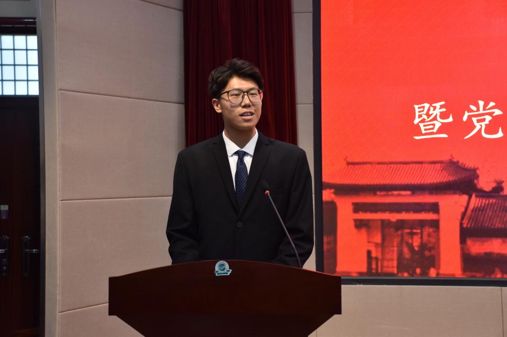 新党员代表2019级本科生牛铖元进行发言。他表示,作为新时代的青年党员,要不断提高自身的政治修养,在实践中积极探索,将自己的智慧和青春融入到党的事业和全心全意为人民服务的根本宗旨之中,努力成为社会所需的复合型人才,用自己的实际行动践行铮铮誓言,为党和人民贡献自己的青春和力量。