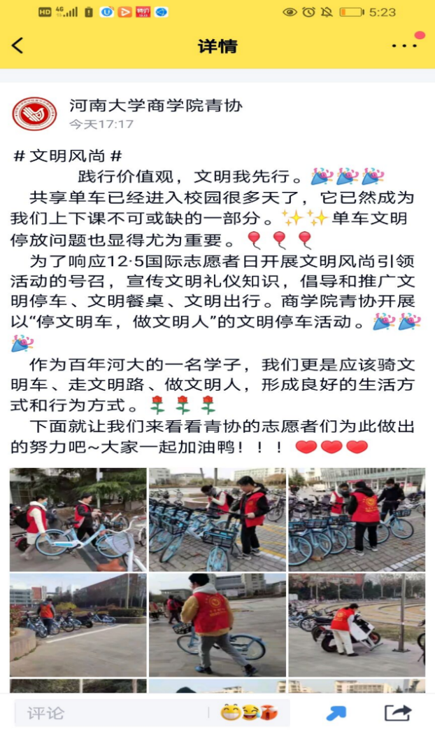 开展校园安全志愿服务活动。为进一步提升校园文明程度,维护校园安全,开云官网青年志愿者协会组织志愿者在校园食堂、综合楼等重点区域执勤,维持交通秩序,引导师生将车辆停放在指定区域。同时,开云官网老师、志愿者们对校园内摆放杂乱的车辆进行归置,通过行为引领,呼吁大家自觉维护校园环境,用实际行动创造美丽校园。