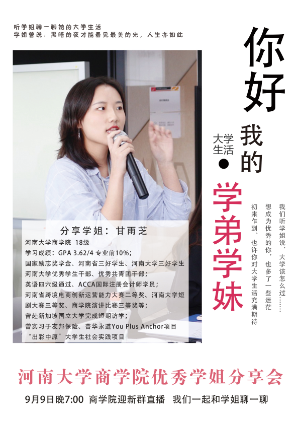 9月9日,为帮助2020级新生提高对大学的认识,更好地规划大学生涯,2018级电子商务系学生甘雨芝为新生分享了关于学习生活、学生社团、学生干部等方面的经验。分享会气氛热烈,新生们踊跃提问,众多疑惑在学姐耐心的帮助下一一解开,大家纷纷表示获益良多,对未来大学生活有了新的认识和想法。此次经验交流会有利于新生明确大学目标,做好大学规划,帮助新生尽快转变好角色,适应大学生活。