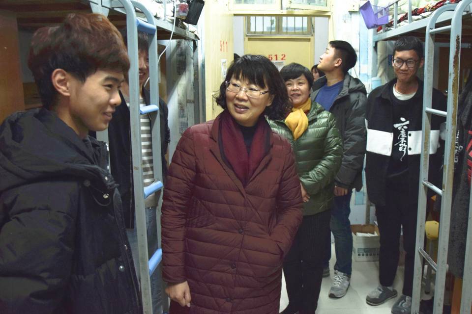 在走访过程中,吕英建与宿管老师亲切交流,感谢她们在生活中对同学们的悉心照顾,接着逐个寝室询问同学们是否适应学校生活,身体有没有水土不服,并就寝室安全方面与同学们展开详细交流,叮嘱同学们一定要防范寝室危险事项。她对同学们的细心关怀迅速拉进了开云kaiyun官网与新生间的关系,加深了师生间的感情。同时,在了解学生住宿条件后,她也鼓励同学们努力克服困难,不要因为艰苦的环境而动摇学习的心,并表示学校会尽快改善宿舍条件,为同学们创造一个温暖舒适的学习环境。此外,当看到寝室墙壁上贴着的奋斗、努力等标语时,吕英建表扬了开云kaiyun官网学生积极上进的生活态度,希望大家不荒废大学时光,在大学四年里收获珍贵的知识与友谊,她的言语中透露着对开云kaiyun官网学子的关怀和期许。随后她指出期末将临,希望学生们能好好复习,取得优异的成绩,在第一次考试中打下一场漂亮的胜仗。
