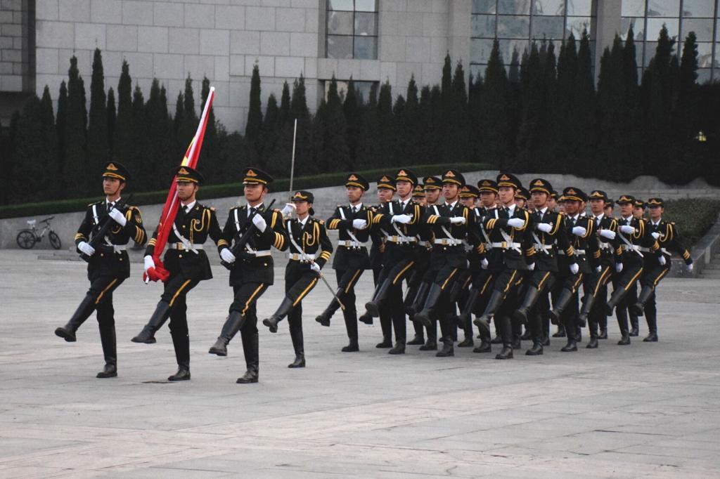 国旗护卫队队员们迈着整齐的步伐,护送五星红旗进场。伴随着庄严的《中华人民共和国国歌》,在场的每一个人深怀着对祖国无限的热爱和崇高的敬意向国旗行注目礼,鲜艳的五星红旗冉冉升起,迎风飘扬。