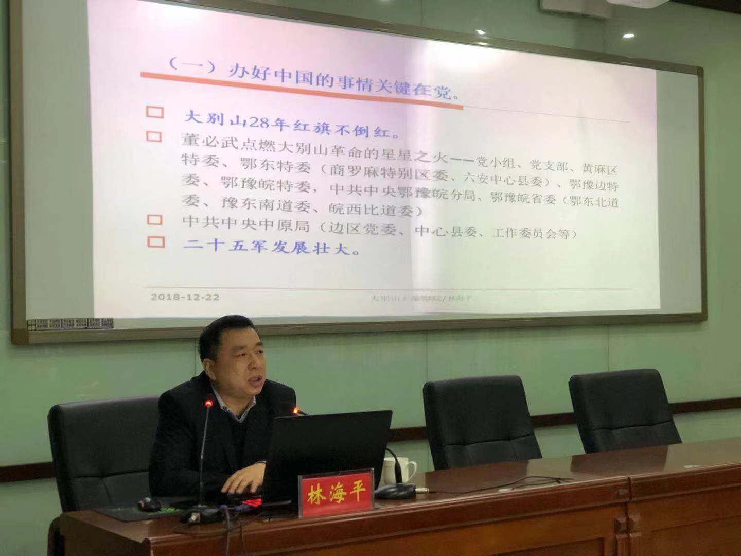 为深入学习贯彻习近平新时代中国特色社会主义思想和党的十九大精神,进一步推进“两学一做”学习教育常态化制度化,教育党员干部继承革命传统,加强党性修养,提升能力素质,学院于2018年12月21日-23日在大别山干部学院举办了以“党的建设高质量推动学院发展高质量”为主题的党员干部学习培训班。院党委书记冯海清,副书记吕英建,系支部书记、系主任参加了本次培训。