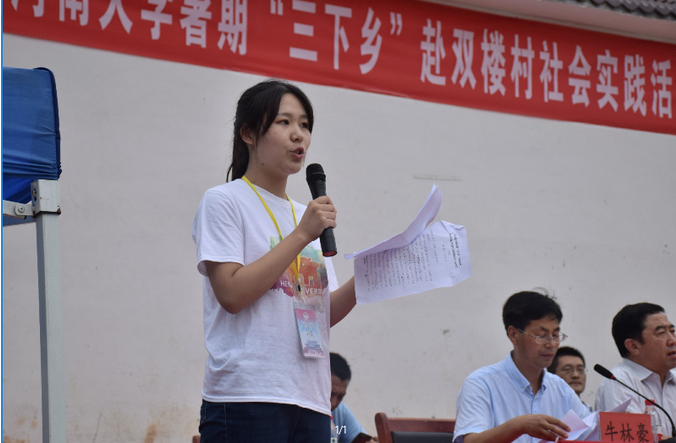 国际教育学院学生王妍瑾作为学生代表发言。她说,为了更好的践行团中央提出的“学思悟十九大,助力建功新时代”的伟大主题,学校组织安排主题为“爱筑双翅,梦栖双楼”的暑期社会实践活动,旨在为双楼小学的留守儿童展开课业帮扶、心理辅导等活动,了解现状,积极思考如何解决贫困地区留守儿童心理疏导、教育缺失等问题,不断提升学生的民情认知度和社会责任感。努力用自己的所感所学托举双楼小学孩子们的梦想。