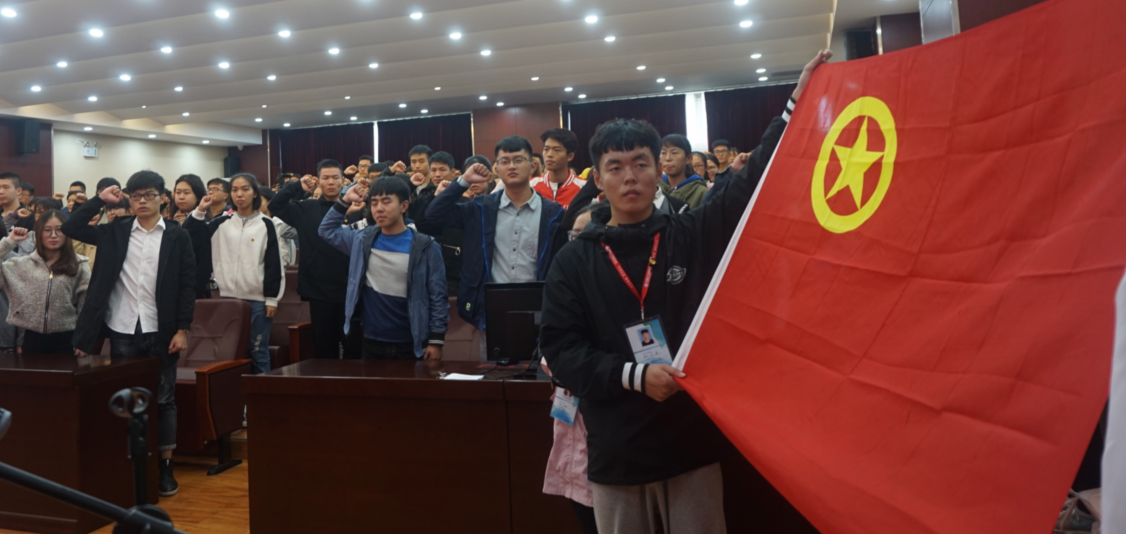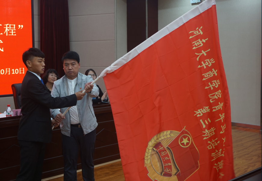 校团委书记翟新礼向学生代表授旗。最后,全体起立,重温入团誓言,仪式在激昂的团歌中结束。