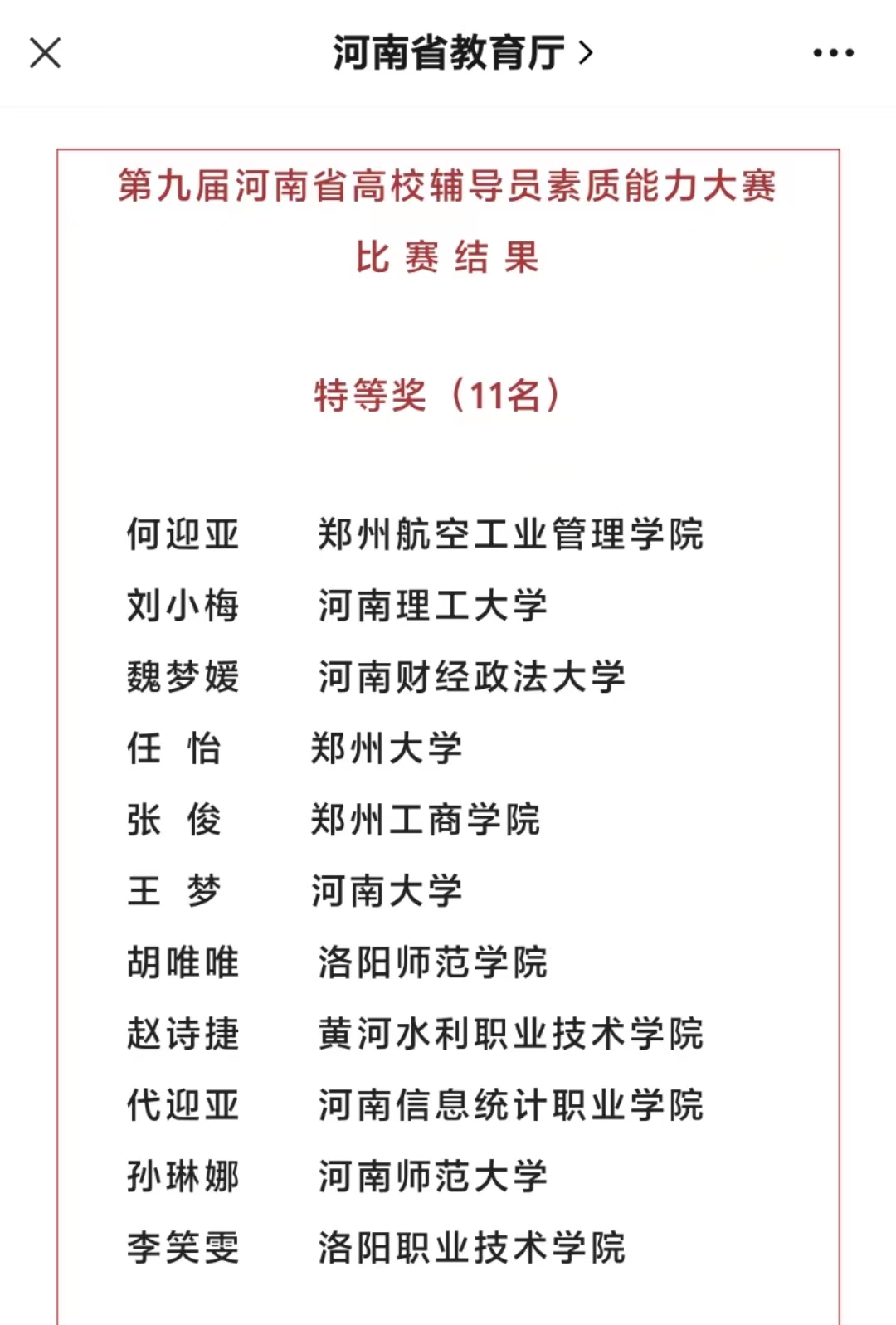 4月27日至5月11日,第九届河南省高校辅导员素质能力大赛如期举行。本次比赛由中共河南省委教育工委、河南省教育厅主办,河南理工大学承办。由于疫情防控要求,本次大赛首次采用线上的方式进行。全省130所高校的辅导员们同场竞技,经过初赛、复赛两轮淘汰,最终30位辅导员进入决赛,经过激烈角逐,开云官网辅导员王梦获得特等奖。