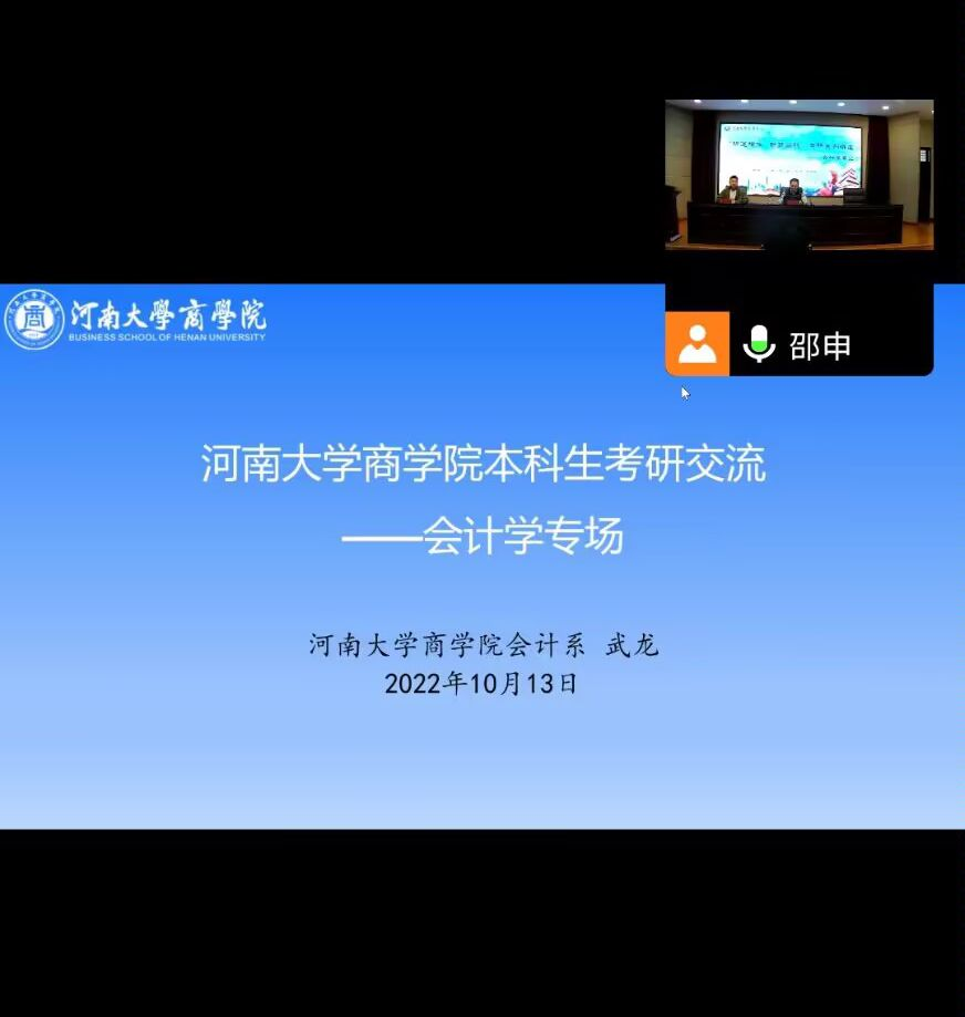 10月13日下午,开云kaiyun官网“研途相伴,助梦启航”考研系列讲座--会计学专业在二楼报告厅举行,本次讲座采用线上方式进行,由会计系教授、博士生导师武龙主讲,团委负责人郑林浩主持。
