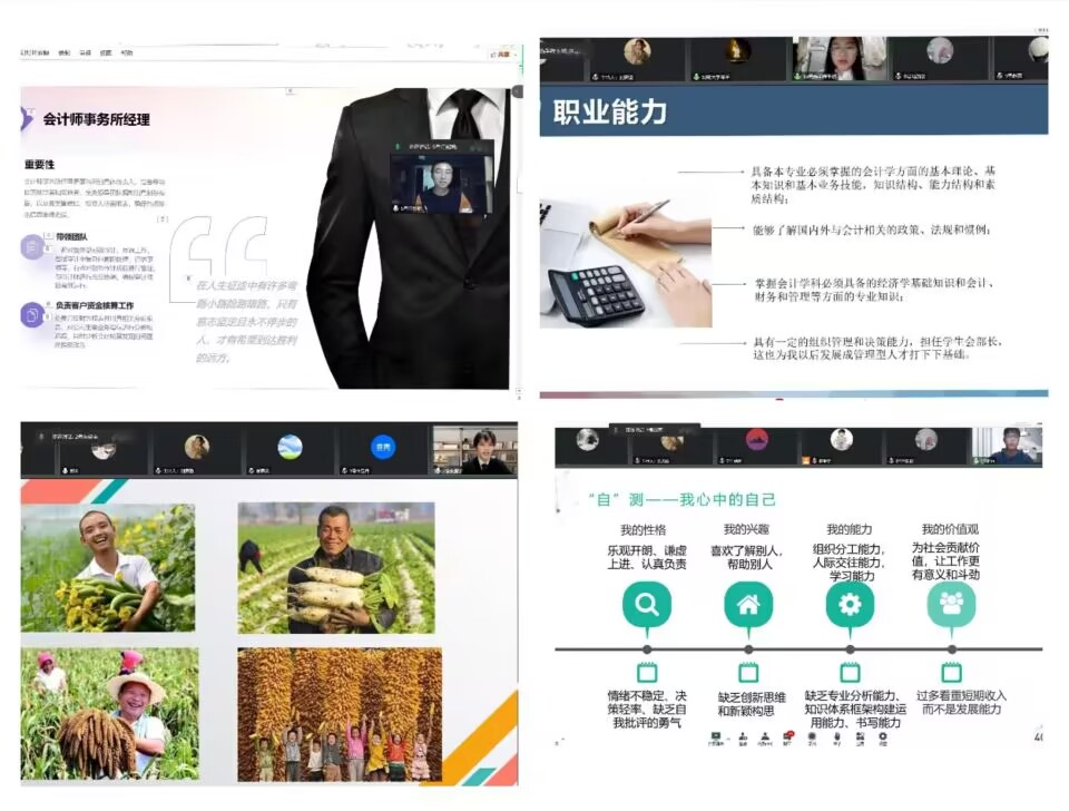 本次比赛包含个人职业生涯规划书展示和PPT汇报两个部分,选手们围绕自我认知、职业认知、职业决策、职业计划路径、评估调整等步骤,运用SWOT分析和霍兰德职业兴趣测试等理论,撰写个人职业生涯规划书并进行线上汇报。各参赛选手结合自己目前实际情况,着重介绍自我如何制定并调整目标,以及在大学生活和毕业后几年的人生规划。各参赛人员逻辑清晰、沉着冷静的畅谈自己的职业生涯规划。2020级的朱望宇讲到,作为一个农村长大的孩子,我深知农产品对于农民生存发展的重要性。在当下社会,国潮兴起,国产品牌得到了更多的关注,我开始思考是否农产品品牌也能够乘上这样的东风,因而我将我的职业生涯规划目标设定为助力于农产品品牌推广的营销策划者。