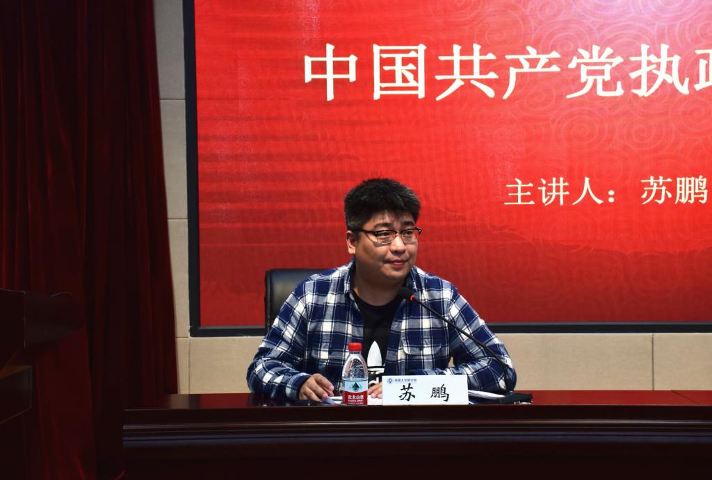 首先,苏鹏带领学员们一起回顾了新中国成立以来中国共产党执政的光辉历程,他指出,马克思主义、毛泽东思想、中国特色社会主义理论体系是党必须长期坚持的指导思想和重要理论,是党最宝贵的政治和精神财富。随后,他从旗帜、道路、执政方式、执政党建设四个方面阐述了中国共产党执政的基本经验。他指出,社会主义的根本任务是解放和发展生产力,要高举中国特色社会主义旗帜,重视马克思主义理论,遵循功能主义社会主义观和现实主义社会主义观。接着,苏鹏向大家解读了中国特色社会主义道路的重要性和特殊内涵,并通过分析人治和法治的区别讲述了我国共产党的执政方式,最后简要叙述了我国的执政党建设。