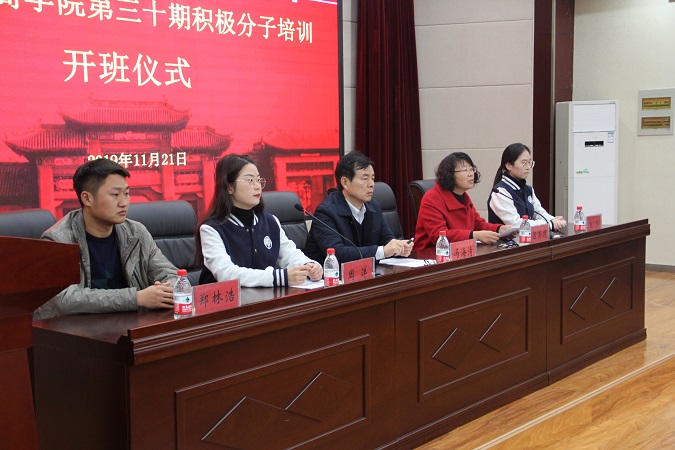 仪式伊始,全体起立,奏唱国歌。随后,吕英建发表讲话,她首先对参加本次积极分子培训的171位学员表示热烈的祝贺,并对新学员提出以下几点要求:一、认真学习,提升自身素质;二、深入学习党的性质、宗旨、根本任务、奋斗目标等党的理论;三、志存高远,筑牢理想信念之基;四、主动参与社会实践,做到知行合一。她希望学员们经过系统的党课学习后能够学有所成,学有所得,学有所悟。接下来学员代表蒋豆进行发言,她代表全体学员表达了将自己锻炼成为具有共产主义觉悟的先锋战士的强烈决心。最后冯海清鞭策同学们,要端正入党动机,提高思想觉悟,坚定理想信念,做到组织上、思想上入党的完全统一。他指出,本次培训深受学校党委重视,不仅在人员上优中选优,课程上也进行了精心设计。勉励学员在学习期间遵守纪律,取得优异学习成绩,争取早日加入中国共产党。