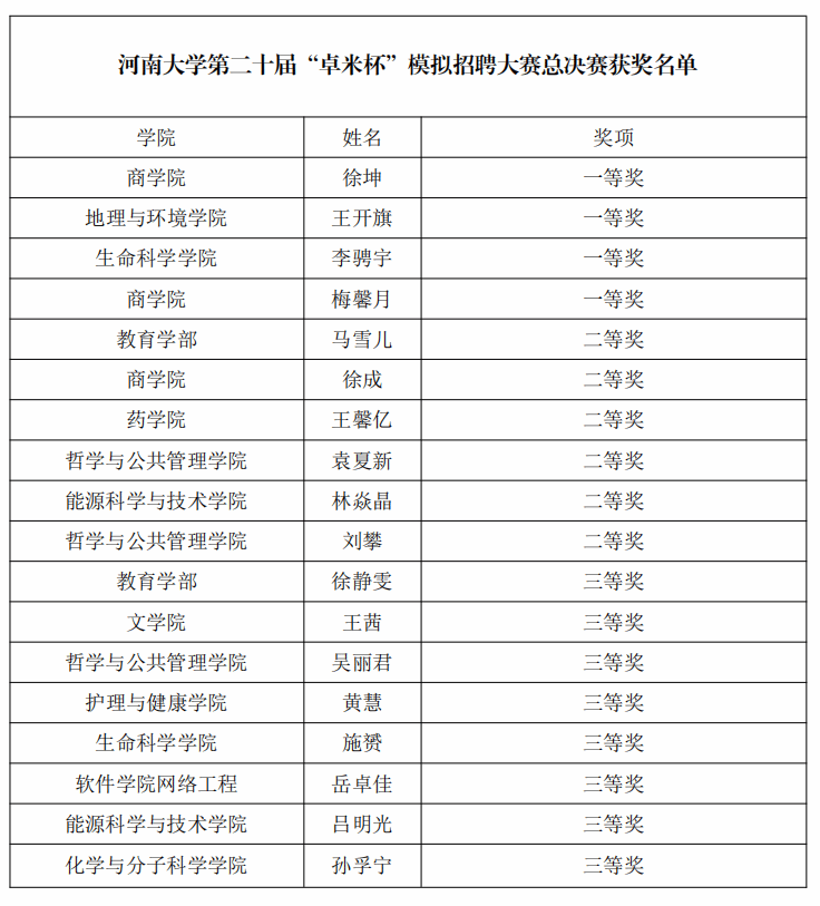 为帮助学生更好地适应职场,引导同学们树立正确的成才观、就业观和择业观,形成“以赛强教、以赛促学、以赛促训”的良好氛围,5月30日下午,开云kaiyun官网第二十届“卓米杯”模拟招聘大赛总决赛在开云kaiyun官网二楼报告厅举行。开云kaiyun官网执行院长席龙胜,校党委学生工作部副部长、学生处副处长曹堃以及校团委副书记董文出席比赛,开云kaiyun官网学工队伍和学生代表现场观摩。本次比赛邀请卓米猎头创始人乔海霞、河南河大科技发展有限公司总经理董保杰、开封市华通成套开关有限公司总经理方山林以及开云kaiyun官网教师谢周亮、董占奎、徐东洋、周士元担任评委。