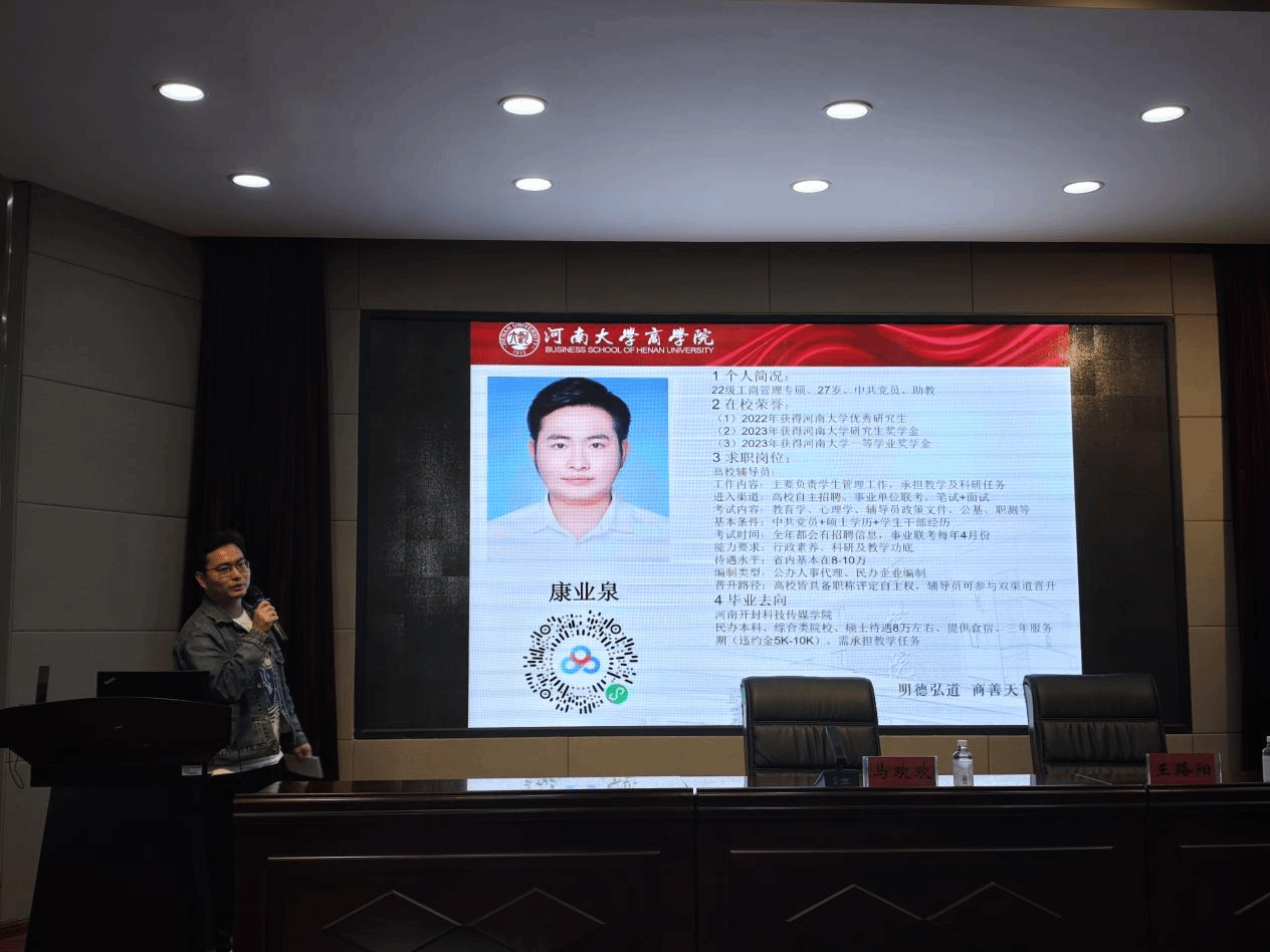 康业泉,2022级工商管理专硕,就业至河南开封科技传媒学院。康业泉结合自己的辅导员求职经验,强调了职业规划的重要性,并提醒大家提前做好准备。他详细地从考试内容、进入渠道、待遇水平等多个方面,为大家介绍了自己的求职经验,并将自己在备考求职过程中所使用的资料进行了细致地整理,然后以网盘的形式分享给了大家,提供了宝贵的参考。