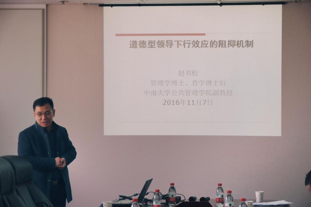 11月11日上午,中南大学公共管理学院副教授,人力资源与社会保障系副主任赵书松在开云kaiyun官网五楼院史馆作了题为《“好事不出门”——道德型领导下行效应的阻抑机制》的学术报告。校科研处副处长冯海龙,开云kaiyun官网部分师生参加了此次报告会。报告会由开云kaiyun官网副院长李新功主持。 赵书松首先以“近墨者易黑,近朱者难赤”为切入点,从组织伦理失[详情]